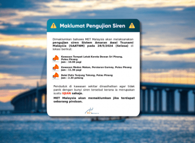 Jabatan Meteorologi Malaysia (MetMalaysia) akan melaksanakan pengujian siren Sistem Amaran Awal Tsunami Nasional Malaysia (SAATNM) bagi tiga lokasi…