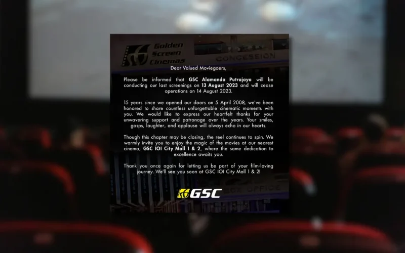 “Sila dimaklumkan bahawa GSC Alamanda Putrajaya akan menjalankan pemeriksaan terakhirnya pada 13 Ogos dan akan menghentikan operasi pada 14 Ogos,” kata syarikat itu di Twitter hari ini.