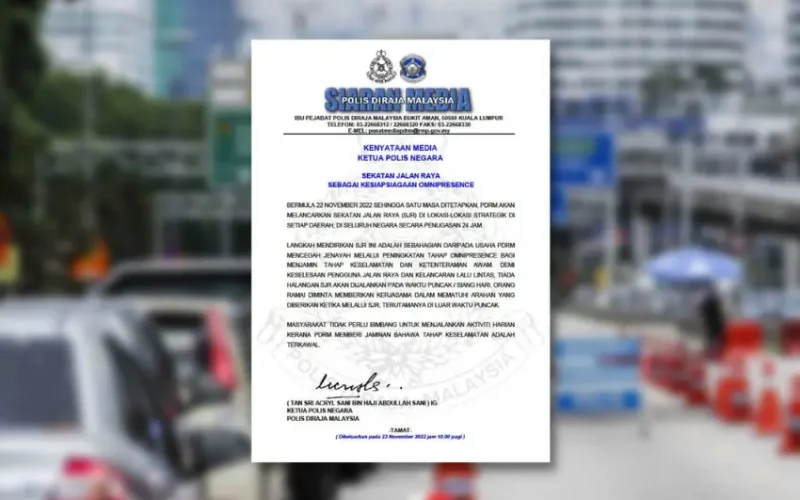 Polis Diraja Malaysia (PDRM) lancarkan sekatan jalan raya (SJR) di lokasi-lokasi strategik di setiap daerah di seluruh negara mulai semalam sehingga satu tarikh ditetapkan bagi menjamin tahap keselamatan dan ketenteraman awam.