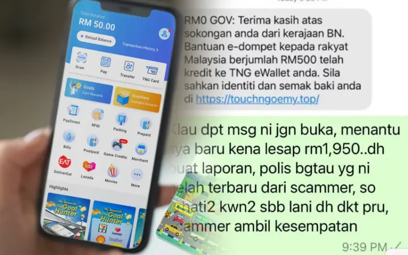 Penipuan tersebut telah mengambil kesempatan ke atas Pilihan Raya Umum ke-15 yang akan datang ini. Ia melibatkan bantuan sebanyak RM500 menerusi TNG yang dihantar melalui SMS.